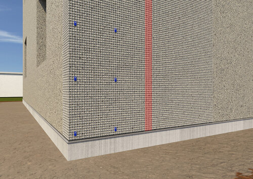 Rull etter hvert ut Armering Exakt. Overlapp > 300 mm og fest armeringen ved å dra med festekam slik at mørtelen flyter opp mellom maskene. Følg armeringsgangen. Armer også over og under åpninger der armeringen ikke sammenfaller med generell armering.