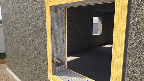 Ved alle hjørner rundt åpninger i veggen monteres ekstra forsterkningsnett i formatet 250 x 500 mm diagonalt. Dersom andre nett forekommer, monteres alltid disse diagonale nettene ytterst. Fortsett på samme måte rundt resten av huset.