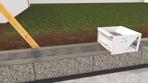 Sag 2 tynne spor per element, 50 mm dype, i den indre vertikale celleplastdelen. Trykk ned vinklet armeringsjern i sporene slik at den korteste siden er vinklet nedover over de øvre armeringsjernene i den ytre kantbjelken. Bind fast jernene i armeringsnettene. Fyll opp 2/3 av grunnens utside med makadam. I kaldere breddegrader kan man frostsikre svakt skrånende mark utover fra grunnmuren med Isolasjonsplate S100, 50 mm, rett kant, utenfor Exakt-elementenes base.