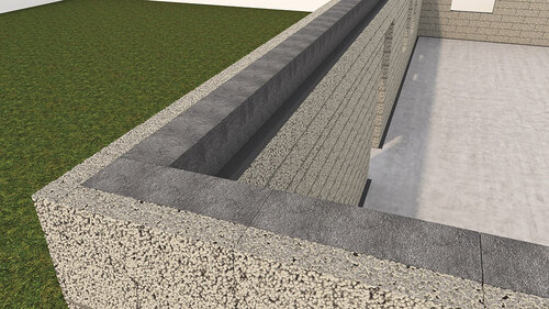 Til grunnmuren brukes Finja Exakt-elementer som bryter kuldebroen med en ferdig utside av børstet betong. Som grunnisolasjon brukes isoleringsplater.