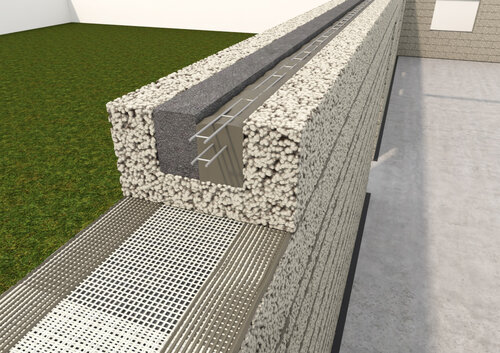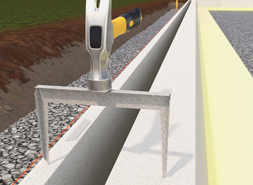 Sag 2 tynne spor per element, 50 mm dype, i den indre vertikale celleplastdelen. Trykk ned vinklet armeringsjern i sporene slik at den korteste siden er vinklet nedover over de øvre armeringsjernene i den ytre kantbjelken. Bind fast jernene i armeringsnettene. Fyll opp 2/3 av grunnens utside med makadam. I kaldere breddegrader kan man frostsikre svakt skrånende mark utover fra grunnmuren med Isolasjonsplate S100, 50 mm, rett kant, utenfor Exakt-elementenes base.