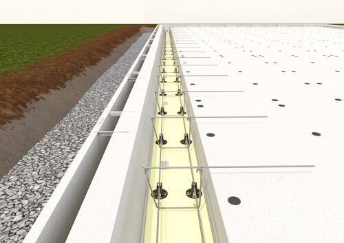 Plasser armeringsavstandsstykker i den ytre og indre kantbjelken, 1 stk per 600 mm og per armeringsjern. Tre armeringsbøyler over fire armeringsjern. Plasser bøylene med 600 mm mellomrom og bind dem fast i armeringsjernene i alle hjørnene. Plasser de sammenkoblede armeringsjernene og bøylene i avstandsstykkene i den indre kantbjelken. Ved skjøting overlappes armeringsjernene med 500 mm, og i hjørnene bøyes de.