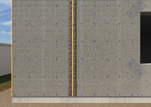 Ved alle hjørner rundt åpninger i veggen monteres ekstra forsterkningsnett i formatet 250 x 500 mm diagonalt. Dersom andre nett forekommer, monteres alltid disse diagonale nettene ytterst. Fortsett på samme måte rundt resten av huset.
