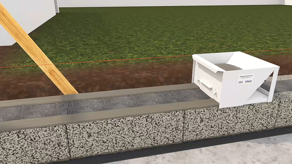 Yttervegger mures med Finja Murmørtel Exakt og Finja Isolerblokk Exakt 350. Exakt-blokkene gir et fuktsikkert, klimavennlig og godt isolert hus. Kjernen av isolasjon midt i blokkene gjør huset energieffektivt. Mørtelen er spesialtilpasset for bruk med Isolerblokk Exakt og Finjas Murkasse Exakt.
